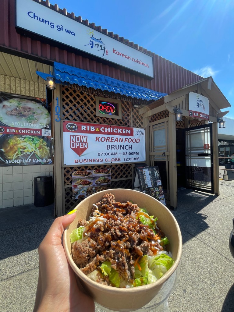 - Rib & Chicken (Korean) – Bulgogi beef bowl with rice; hearty, saucy, and comforting.